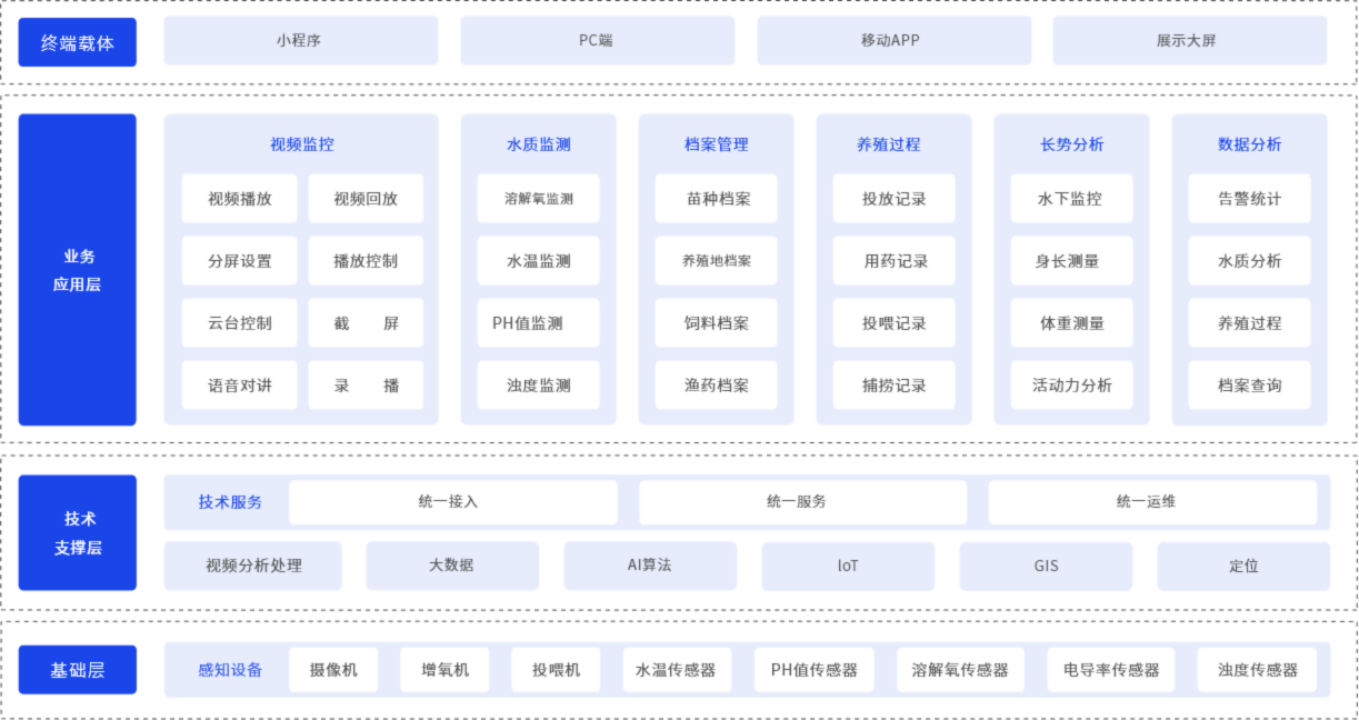 对养殖区域进行视频监控,异常情况实时告警;通过智能传感器实时监测水环境,数据实时收集,告警实时推送,帮助养殖户进行科学养殖。